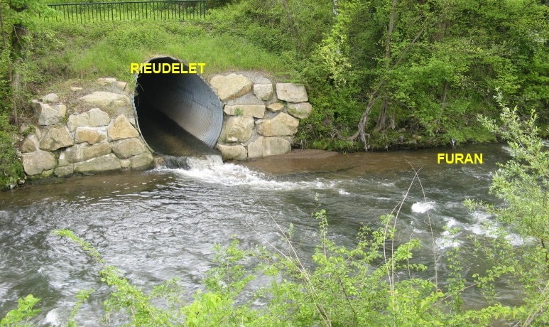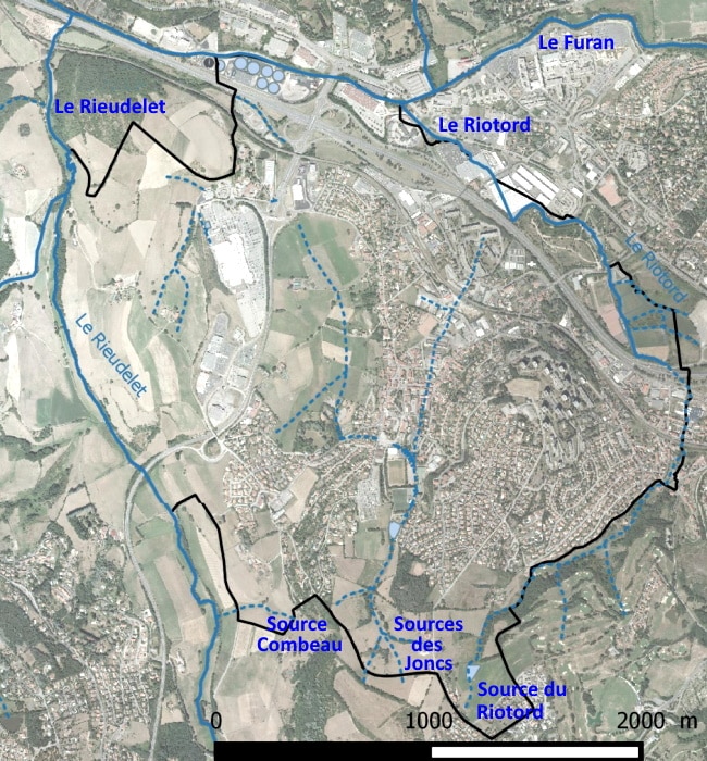Sur cette image provenant du Plan Local d’Urbanisme établit par Épures en 2020 on voit les trois cours d’eau identifiés qui parcourent notre commune, deux ruisseaux, le Riotord et le Rieudelet, et une rivière, le Furan. S’y ajoutent des ruisseaux sans nom comme celui partant de la source des joncs qui alimente la mare derrière le complexe sportif et qui devient souterrain avant de rejoindre le Riotord ou celui de la source Combeau qui rejoint le Rieudelet. On voit aussi deux autres ruisseaux plus ou moins intermittents.