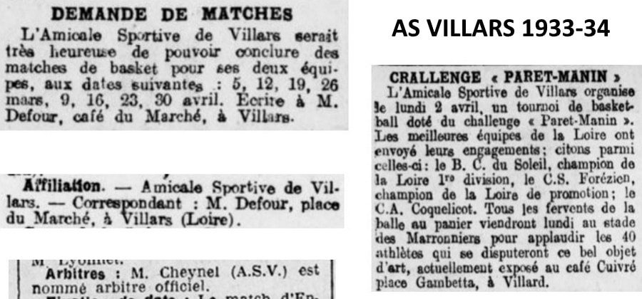 C’est ensuite l’Amicale Sportive de Villars qui prend le relais et s’affilie en février 1933 à la FFBB. Bonnamour et Cheynel sont les arbitres du club et Defour le secrétaire de la section basket. Charet, Moulin, Thévenon, Giraud, Moreau et consorts dribblaient alors avec enthousiasme sous les couleurs villardaires.