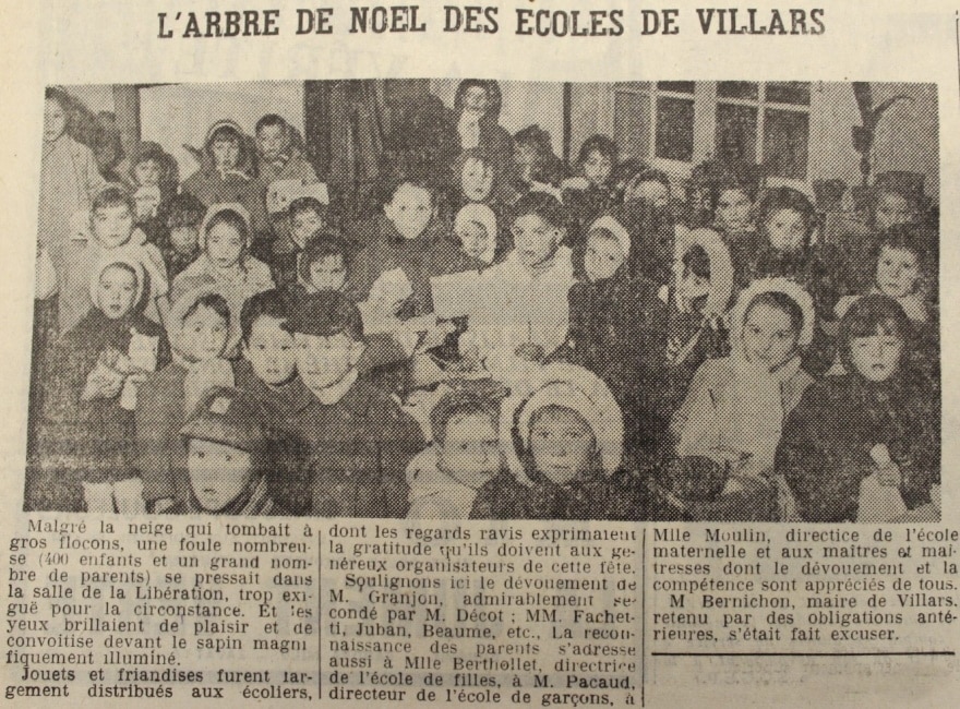 Jouets et friandises furent largement distribués aux écoliers dont les regards ravis exprimaient la gratitude qu’ils doivent aux généreux organisateurs de cette fête. Soulignons ici le dévouement de M. Granjon, admirablement secondé par M. Decot, MM Fachetti, Juban, Beaume, etc. La reconnaissance des parents s’adresse aussi à Mlle Berthollet directrice de l’école de filles, à M. Pacaud directeur de l’école de garçons, à Mlle Moulin directrice de l’école maternelle et aux maitres et maitresses dont le dévouement et la compétence sont appréciés de tous. M. Bernichon maire de Villars, retenu par des obligations antérieures, s’était fait excuser.