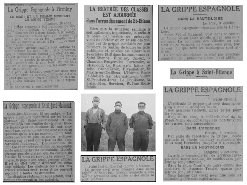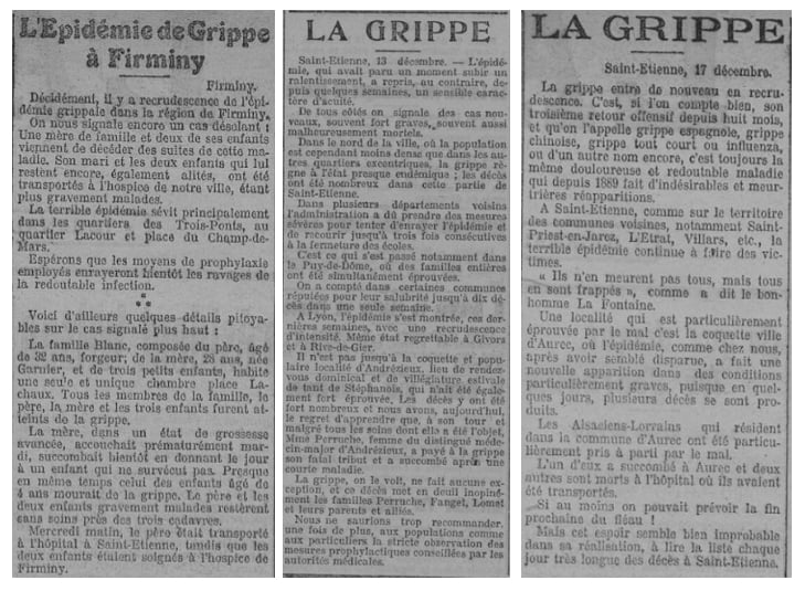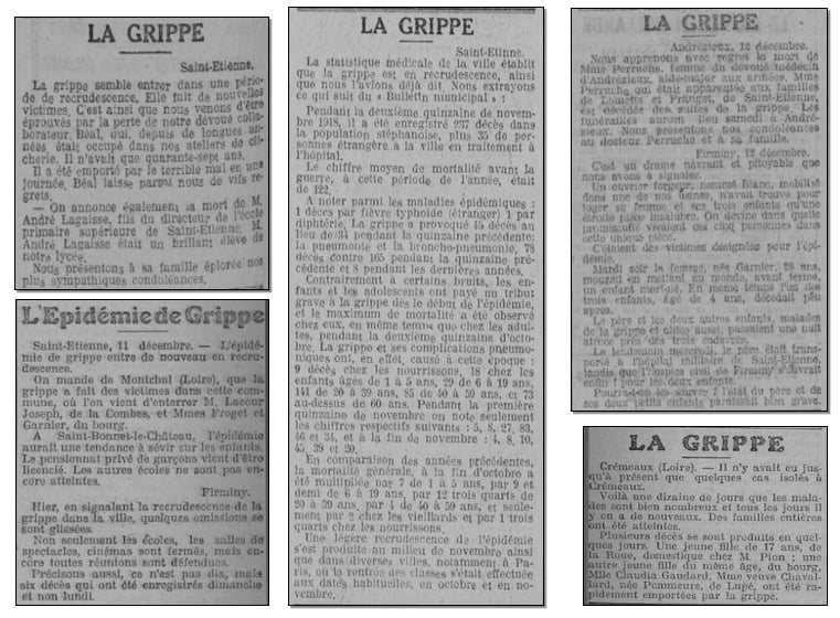 Le 17 décembre 1918 : La grippe sévit avec une intensité nouvelle à Saint-Étienne. Le nombre de décès augmente. À Saint-Priest, Villars et L’Etrat, elle a fait de nouvelles victimes. Aurec (43) a particulièrement souffert de la redoutable épidémie. Les Alsaciens-Lorrains qui y ont cantonné sont particulièrement éprouvés. À Vals (43), on signale une recrudescence de la grippe. Les mesures de propreté recommandées par l’hygiène ne sont guère observées. Il n’y a que par la propreté qu’on arrivera à combattre l’épidémie.