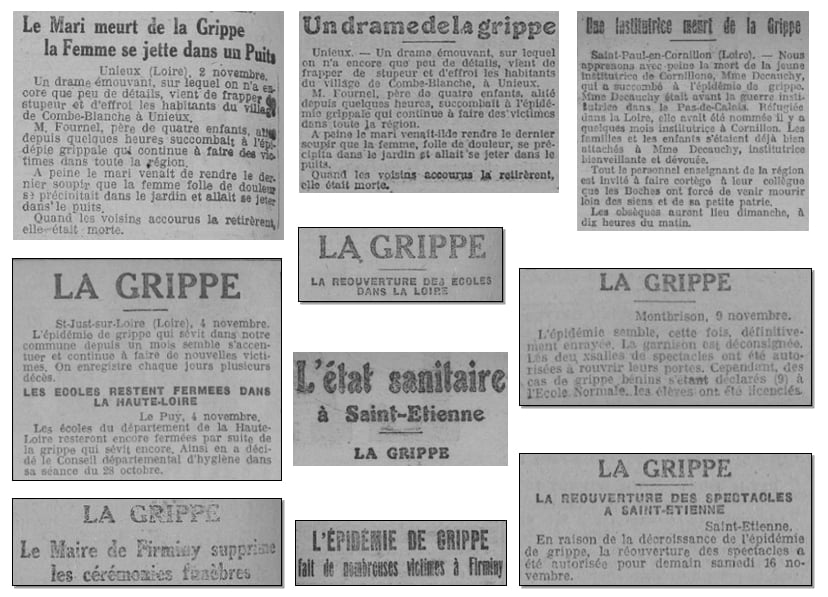 Le 2 novembre 1918 : À Unieux, le mari, père de 4 enfants, meurt de la grippe, sa femme se jette dans un puits et décède. À Saint-Paul-en-Cornillon nécrologie d’une jeune institutrice réfugiée particulièrement dévouée et décédée de la grippe.