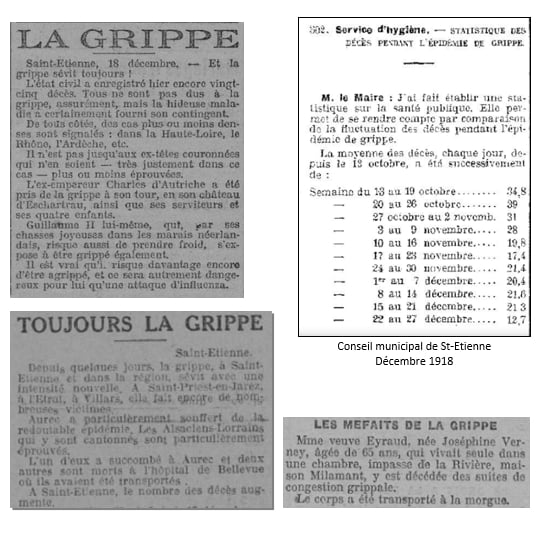 Le 30 décembre 1918 : Publication des statistiques médicales de Saint-Étienne, pour la première quinzaine de décembre. La grippe a provoqué 37 décès au lieu de 45 la quinzaine précédente, il a été signalé 92 cas de grippe maligne. La pneumonie et la broncho-pneumonie ont causé 108 décès contre 165 pendant la quinzaine précédente.