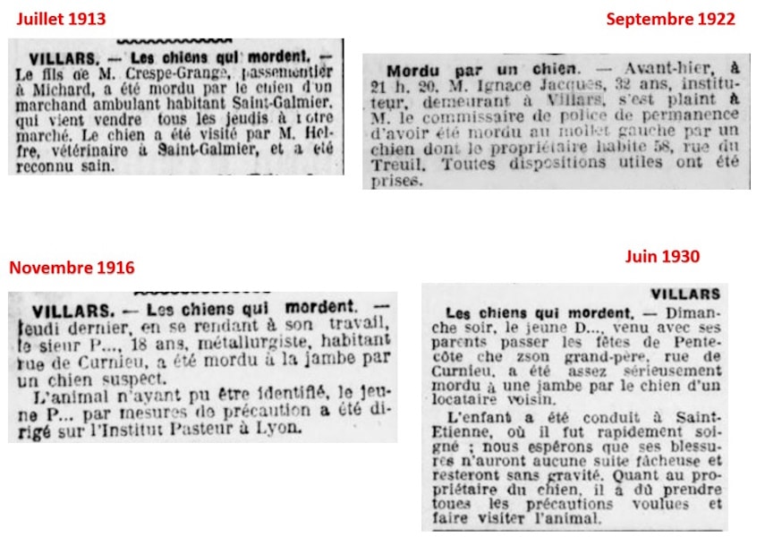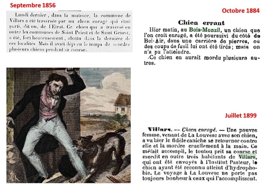 Juillet 1899 : une voyageuse de la Louvesc de passage à Villars est mordue par son caniche enragé qui mord également trois habitants de la commune.