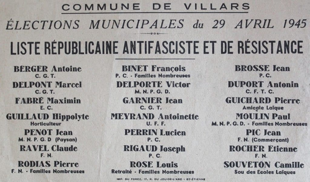 Pour ces élections libres, mais où le comportement durant les années d’occupation pèse lourd, une seule liste est constituée. Elle sera dénommée liste républicaine antifasciste et de résistance. On y retrouve les principaux membres du Comité de Libération, résistants et communistes pour une large majorité. L’instituteur Henri Faure étant fonctionnaire, il ne peut se présenter, la loi est alors ainsi faite. De l’ancien conseil municipal de la période d’occupation, seul Etienne Rocher (ancien adjoint, mutilé de guerre de 14-18) a trouvé grâce aux yeux de la nouvelle équipe. À son crédit, la police allemande a mené une enquête sur son compte, il n’était pas membre de la Légion du combattant et son entente avec le maire évincé Pierre Barrailler n’était plus au beau fixe. De plus il vient d’adhérer au Front National (le Front national de lutte pour la Libération et l’indépendance de la France est un mouvement de la Résistance créé par le Parti communiste français).