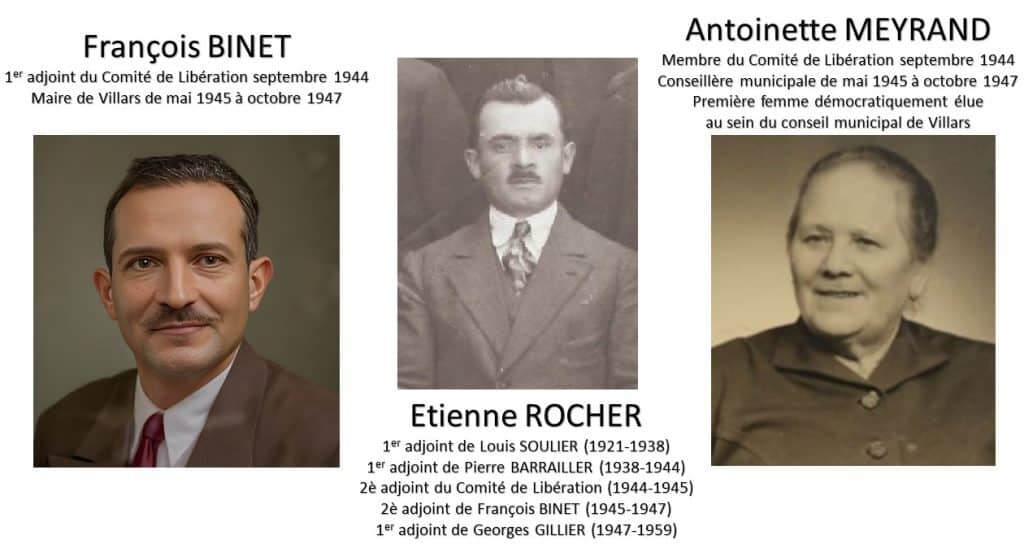 Maire : François Binet, 1er adjoint : Jean Pic, 2è adjoint : Etienne Rocher, 3è adjoint : Paul Moulin. Conseillers municipaux : Antoine Berger, Jean Brosse, Marcel Delpont, Victor Delporte, Antonin Duport, Maxime Fabre, Jean Claude Garnier, Pierre Guichard, Hippolyte Guillaud, Antoinette Meyrand, Jean Penot, Lucien Perrin, Claude Ravel, Joseph Rigaud, Pierre Rodias, Louis Rose, Camille Souveton.
