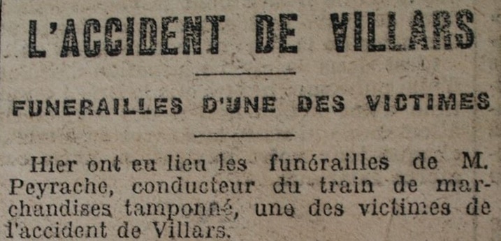 Pendant ce temps, en gare de Villars, on déblayait les décombres à la lueur des lanternes et on retirait bientôt deux cadavres. C’était ceux de Girard le conducteur chef et de Peyroche le conducteur de queue du train tamponné qui furent transportés dans la salle d’attente de la gare.