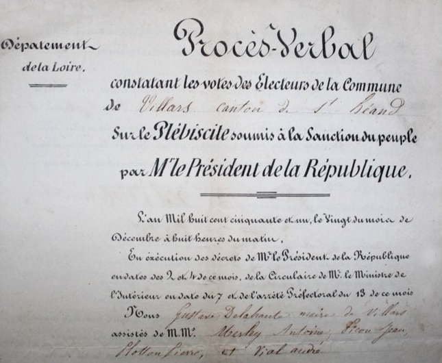 À Villars, les 20 et 21 décembre 1851, 165 électeurs s’expriment : 159 sont pour le oui, 5 pour le non et 1 bulletin blanc ou nul. Ce vote va valider (à 92% des exprimés) la première étape vers le Second-Empire, Louis-Napoléon Bonaparte devenant ensuite Napoléon III, empereur des Français.