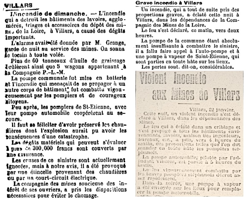 « Villars brûle-t-il ? C’est en janvier 1911 qu’un incendie dont les flammes atteignaient 30 mètres de hauteur, ravagea le criblage et les lavoirs de la Société anonyme des Mines de la Loire. Ce dépôt était situé rue du Breuil à Villars. C’est ici que le charbon était lavé puis trié et aussi expédié par wagons. Il y avait une usine de fabrication de briquettes et un grand parc à bois. Plus de 500 personnes étaient employées pour ces travaux (*). À la suite de cet incendie le Préfet de la Loire devait dissoudre la section des pompiers de Villars ».