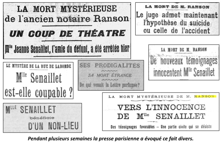 Le nom de sa jeune maîtresse Jeanne SÉNAILLET venait opportunément d’être couché sur son testament et selon certaines sources Pierre RANSON se serait parfois montré violent et jaloux. La belle demoiselle fut donc arrêtée, incarcérée puis remise en liberté provisoire en attendant les résultats d’une longue enquête qui n’apporta aucune preuve probante. Elle bénéficia donc d’un non-lieu et emporta avec elle une partie de la fortune du riche Villardaire. La petite histoire raconte qu’il aurait aussi fait don à la commune d’une maison située à l’Arsenal.