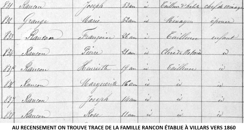 Ses parents Joseph RANCON (1836-1900) et Marie GRANGE (1837-1918) se sont mariés à Villars le 13 septembre 1862. Lui était originaire de Saint-Vincent en Haute-Loire et il s’établit à Villars comme tailleur d’habits. L’affaire marche plutôt bien et il y associe ses enfants. Il aura pignon sur rue à l’Arsenal (rue Marceau à l’époque) jusqu’à son décès. Son épouse était quant à elle passementière à la Boutonne où elle était née.