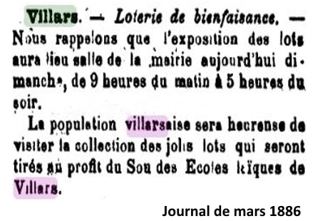 D’autre part à cette époque on n’a pas encore donné de nom aux habitants de la commune. Alors depuis quand appelle-t-on les habitants les Villardaires ? C’est visiblement beaucoup plus récent, même si on n’a pas pu retrouver de date précise dans les transcriptions écrites. Dans la presse ancienne et même assez récente, on parle simplement des habitants de Villars sans utiliser de gentilé. Toutefois dans un journal de mars 1886, il est fait état de « la population villarsaise » en ajoutant simplement la terminaison « aise » au nom de Villars !