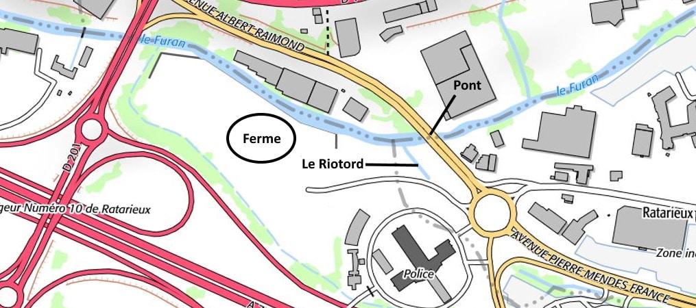 Sur le plan ancien reconstitué à partir de trois planches différentes, on voit le Furan avec son affluent le Riotord, le pont qui a été emporté et la ferme entourée d’un cercle.