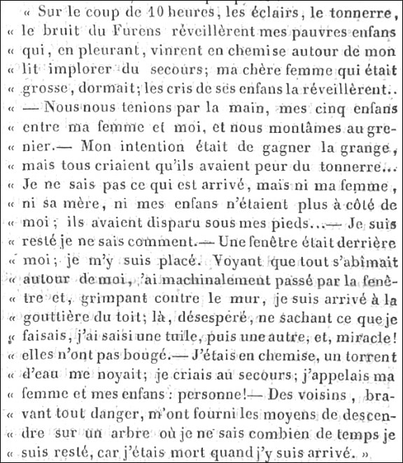 Vers 23 heures, le pont contre lequel s’étaient amassés les arbres et débris de toutes sortes charriés par le Furan est emporté laissant passer une vague destructrice qui submerge la ferme dans laquelle une famille de huit personnes vivait. Seul le père, après avoir inutilement cherché à arracher à la mort femmes et enfants, put trouver son salut en s’échappant par le toit et en s’agrippant à un arbre comme il le raconte dans cet émouvant témoignage.