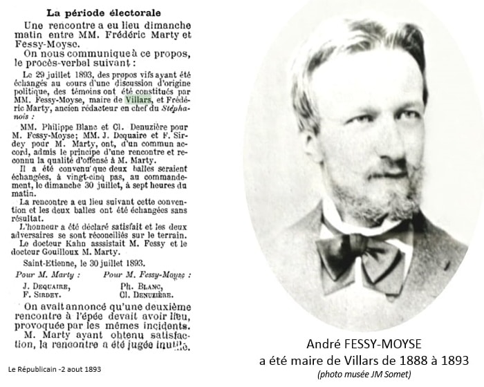 De récentes recherches aux archives départementales ont fait ressortir un fait divers pour le moins étonnant, publié dans le journal « le Républicain ». Il concerne le duel au pistolet qui opposa le dimanche 30 juillet 1893 André FESSY-MOYSE, alors maire de Villars, à Frédéric Marty, ancien directeur du journal « Le Stéphanois ».