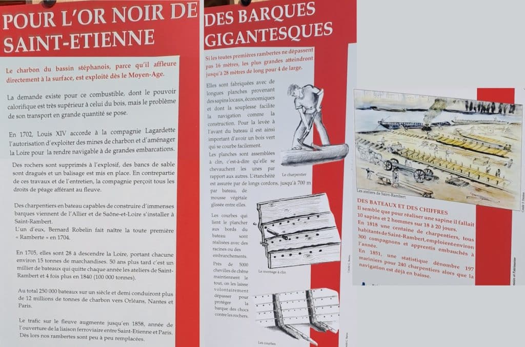 À Saint-Just-sur-Loire et à Andrézieux, le charbon était chargé sur des bateaux à fond plat, appelés rambertes ou sapines, d’environ 25 m de long et 4 m de large, transportant jusqu’à 35 tonnes. Ces bateaux descendaient la Loire jusqu’à Roanne et, ne pouvant remonter, étaient vendus comme bois de charpente ou de chauffage. On estime qu’il fallait 10 sapins pour construire une ramberte ce qui n’a pas été sans conséquence sur la forêt. Entre 1704 et 1858, 250000 rambertes ont transporté 12 millions de tonnes de charbon.