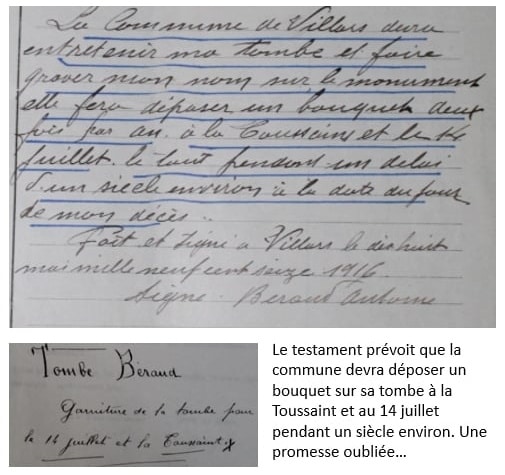Précision plus singulière il était également exigé dans son testament que la commune entretienne sa tombe, y fasse graver son nom et y dépose un bouquet deux fois par an, à la Toussaint et au 14 juillet, pendant un siècle environ à dater du décès. Une tradition qui est tombée dans l’oubli au fil des ans.