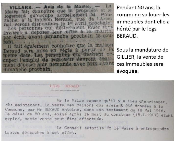 Sans descendance directe, Antoine BERAUD fait alors don par testament à la commune de sa résidence et de tout un pâté de maisons situé rue Danton dont il était propriétaire. Un bel ensemble (estimé à 53 000 francs de l’époque) qui générait alors un revenu annuel locatif de 2500 francs.