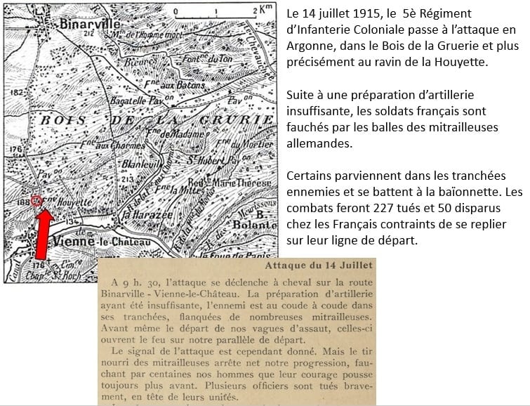 Lampiste au puits de la Chana, ce dernier a été mobilisé en septembre 1914 au 5è Régiment d’Infanterie Coloniale à Lyon. Et après quelques mois d’instruction militaire, il vient de rejoindre les premières lignes. Son régiment se trouve en forêt d’Argonne, entre Reims et Verdun. Un secteur très animé où les offensives se succèdent. Les Français ont d’ailleurs prévu de passer à l’attaque en ce 14 juillet 1915 dans le bois de la Gruerie. Une sanglante offensive pour gagner quelques mètres de terrain dans une forêt séculaire hachée par les balles et les obus.