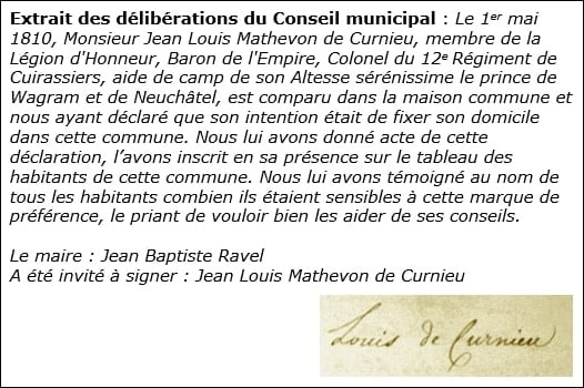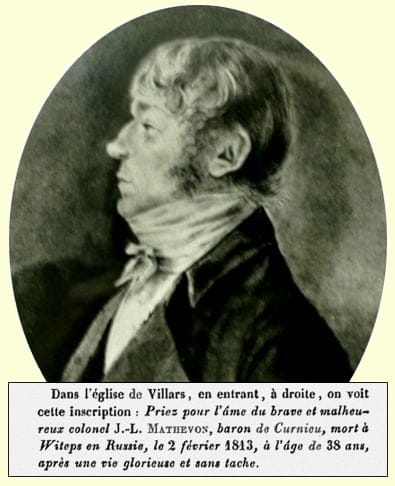Ce que l’on sait avec certitude aujourd’hui, c’est que Jean Louis Mathevon de Curnieu, bonapartiste affirmé, était colonel au 12è Régiment de Cuirassiers au sein de la grande armée napoléonienne. Baron d’Empire par décret du 15 aout 1809, il a été fait citoyen d’honneur de la commune de Villars le 1er mai 1810, en sa présence. Trace en est laissée dans les comptes rendus du conseil municipal.