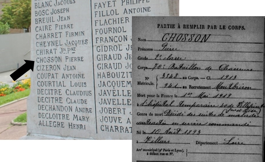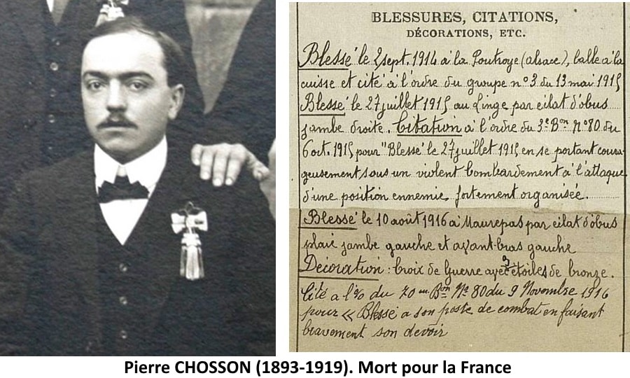 Né le 10 août 1893 à Villars, Pierre Chosson a d’abord laissé une trace de son passage à l’école communale de 1899 à 1907. On y souligne son « excellent caractère ». Il a ensuite poursuivi son parcours scolaire à l’école professsionnelle libre de la rue Sainte-Barbe à Saint-Étienne puis il est parti travailler à la mine.