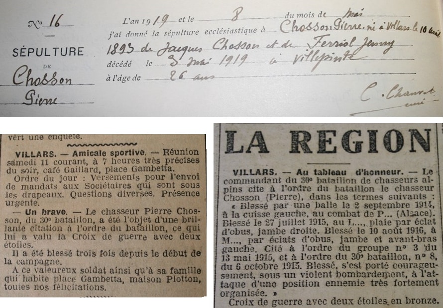 Détail navrant, il a été mobilisé en même temps et dans le même bataillon que son camarade villardaire Firmin Charret. Ils seront blessés tous les deux en juillet 1915 au combat du Linge et évacués dans les hopitaux. Mais Charret y décédera des suites de ses blessures de guerre.