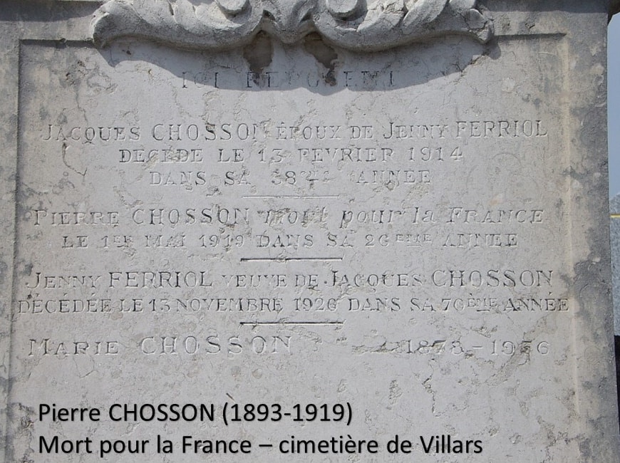 Il est revenu entre quatre planches le 8 mai 1919 pour sa messe de funérailles célébrée à l’église par le curé Chauvet. Il est inhumé au cimetière de Villars où l’usure du temps commence à effacer son nom.