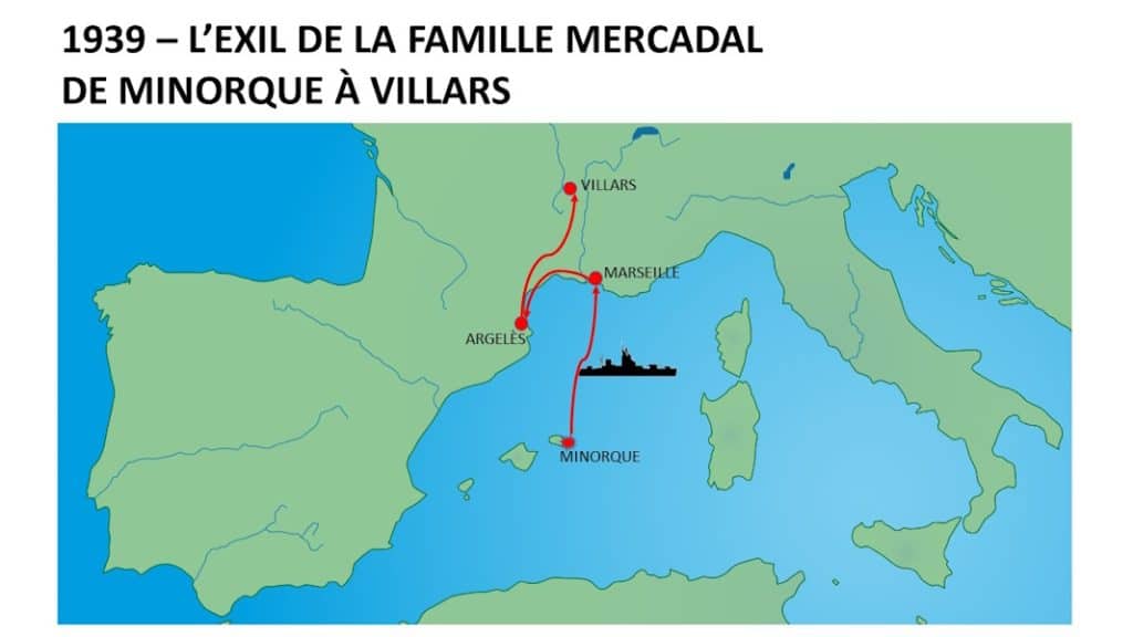La famille Mercadal (composée de 9 frères et soeurs avec parents et enfants) doit alors fuir le Franquisme et tout abandonner sur place. Contrainte et forcée, elle quitte son île natale le 9 février 1939 avec 450 autres réfugiés à bord du croiseur britannique « le Devonshire » venu leur porter assistance.