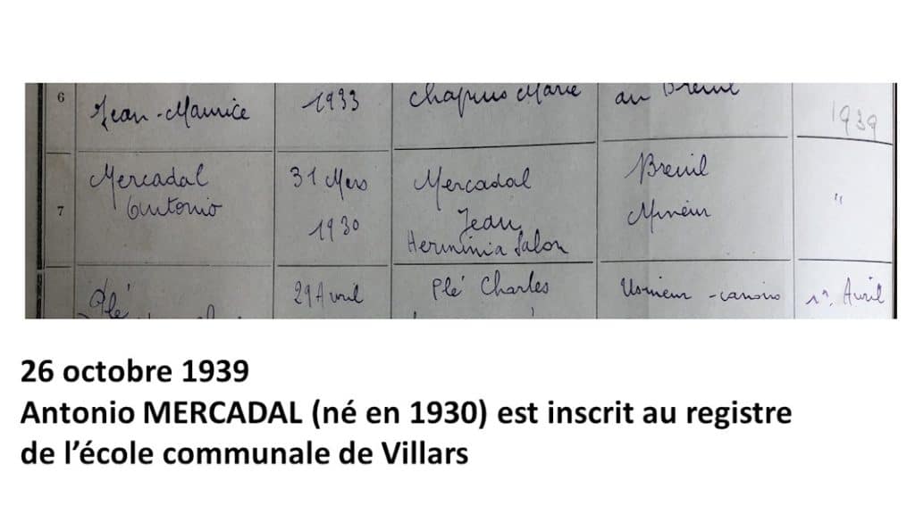 Leur fils ainé, le petit Antonio (9 ans, il est né en 1930) apparait dans le registre des effectifs scolaires de l’école communale de garçons, il y est enregistré à la date du 26 octobre 1939. Il n’a alors probablement qu’une connaissance très limitée du français. Mais c’était aussi le cas d’autres réfugiés passés par Villars. Son père est alors déclaré comme ouvrier mineur, habitant au Breuil.