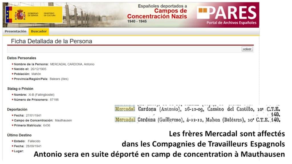 Après la défaite, la Wermacht et les Einsatzkommandos vont faire prisonniers plusieurs milliers de ces prestataires étrangers en zone occupée. Sur ordre d’Hitler, ceux-ci sont, à partir du mois de septembre 1940, dépossédés du statut de prisonniers de guerre, remis à la police secrète d’État et conduits dans des camps de concentration en Allemagne. C’est le cas d’Antonio Mercadal (surnommé Xuqui), l’aîné de la famille.