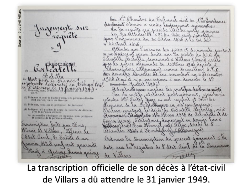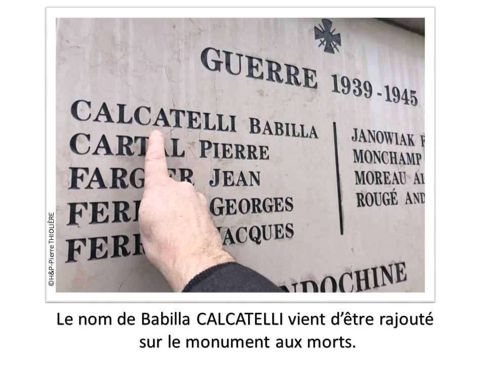 Après 80 ans d’oubli, son nom vient d’être rajouté sur le monument aux morts de la commune car Babilla Calcatelli, sujet italien, n’a laissé qu’une trace éphémère de son passage à Villars. Mais dans les registres de l’état civil, la transcription de son décès apparait en 1949 avec la mention marginale « mort pour la France » et quelques bribes d’informations sur les circonstances de sa disparition.
