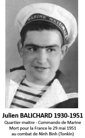 (*) Julien Balichard, né en 1930 à Sail-sous-Couzan, a suivi l’exemple de son frère en s’engageant dans la Marine Nationale le 9 mai 1949 pour une durée de 5 ans. Le 1er juin 1950, il est affecté au Commando de Marine « François » en Indochine.