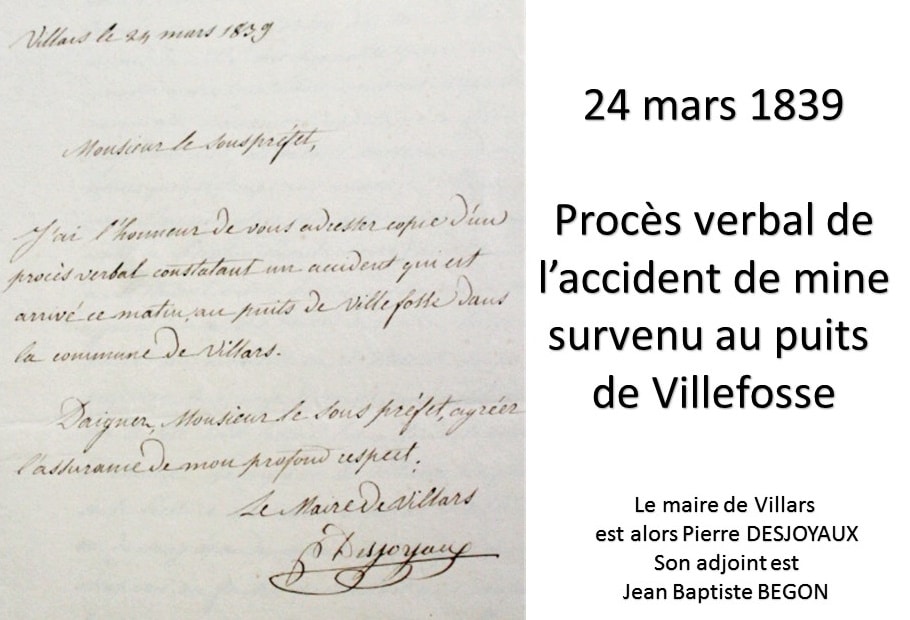 Aujourd’hui vingt-quatre mars 1839 à 8 heures du matin, nous Jean Baptiste Begon (1), adjoint à la mairie de Villars, soussigné, en remplacement de M. le Maire empêché, ayant appris qu’un accident avait eu lieu au puits de Villefosse dépendant de la concession des mines de houille de Villars et situé dans ladite commune, nous nous sommes transportés auprès dudit puits où, étant arrivé, nous avons vu le corps d’un homme sans vie qui venait d’être retiré dudit puits et auprès duquel nous avons trouvé Messieurs Gervoy (2), directeur de la compagnie des mines de Villars et Hyppolite (sic) Girard, entrepreneur mineur qui, sur notre invitation, nous ont dit que la victime se nommait Lacroix Baptiste, né à Firminy, âgé de 22 ans, célibataire, profession de mineur, employé depuis quelque temps aux mines de Villars. Qu’il travaillait avec Baptiste Foraison, autre mineur, âgé de trente ans, natif de Riotord (Haute-Loire), audit puits de Villefosse où ils étaient entrés hier à dix heures du soir pour sortir aujourd’hui à six heures du matin, lorsque sur les cinq heures, au moment où ils étaient occupés tous deux à préparer leur coup de mine, une petite pierre qui est tombée sur la tête dudit Lacroix lui a fendu le crâne et l’a tué sur le champ.