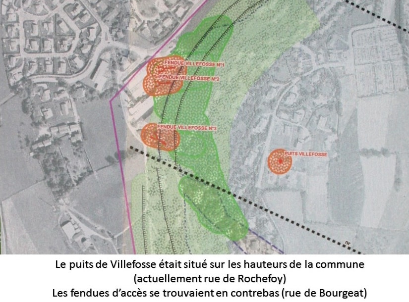Le puits Villefosse a été foncé en 1838 (diamètre 2,65 mètres et profondeur de 160 mètres), avec installation d’une machine vapeur de haute pression de 23 chevaux. Il était situé près de l’actuelle rue de Rochefoy peu après l’allée des Baies (altitude 559 m).