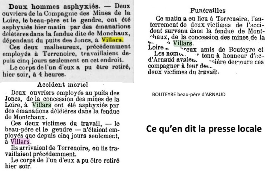 Les registres de l’état civil de la commune apportent un complément d’information sur ce drame. D’après la transcription des deux décès, l’accident est survenu le 12 avril 1890 à quatre heures du soir au Puits Gallois. Ce puits communiquait en effet avec la fendue Montchaud située sur la commune de Saint-Genest-Lerpt mais appartenant à la concession de Villars.
