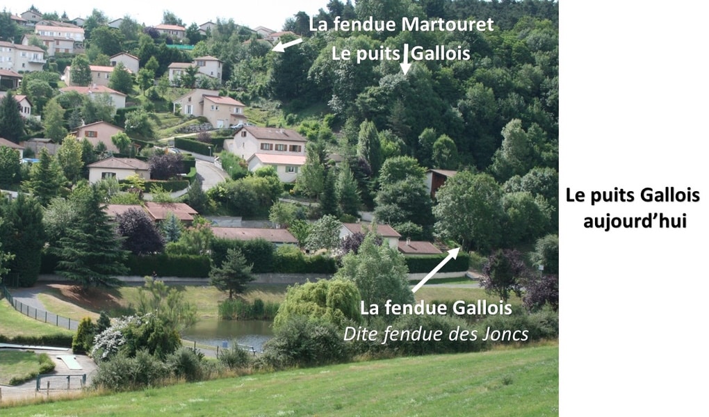 Un peu en dessous (à la pointe du plan d’eau actuel, vers la montée d’escaliers) se trouvait la fendue du puits Gallois (ouverte en 1854) et au-dessus du puits était exploitée la fendue Marthouret.