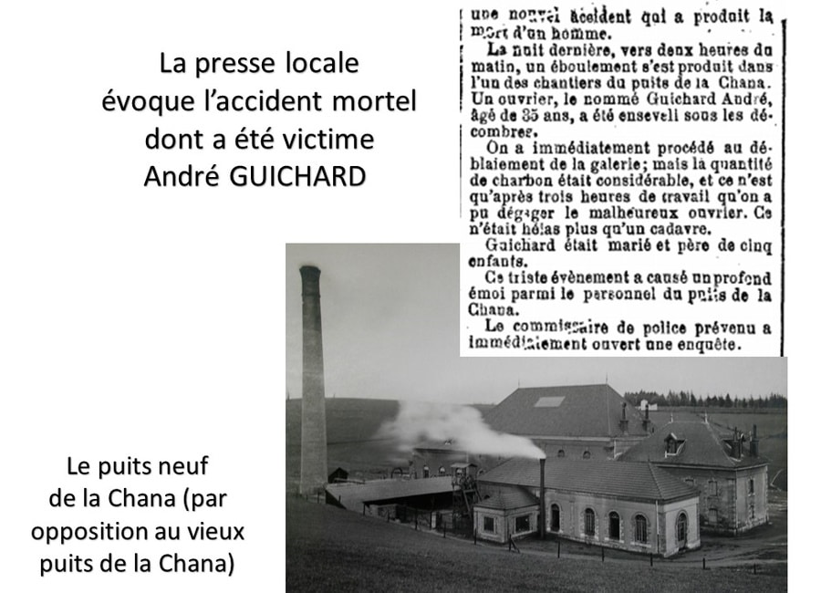 Le 25 juillet 1897, la mine faisait une nouvelle victime au puits neuf de la Chana. Le puits se trouvait dans le secteur actuel du golf (sur Saint-Étienne) alors que l’entrée de galerie et le bâtiment des lavabos se trouvaient coté Villars, rue Kléber.