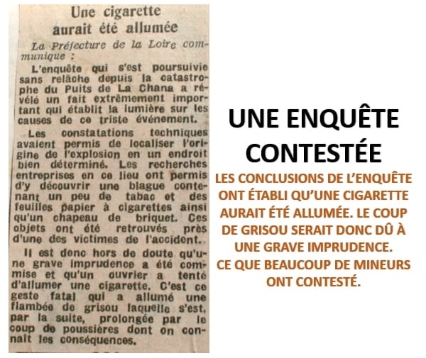 La fédération CGT des mineurs de la Loire a pour sa part toujours réfuté cette thèse. Si au moment des faits, le syndicat était clandestin, cela ne l’a pas empêché de lancer un appel à la grève pour assister aux obsèques et de rappeler que « tous les mineurs ayant le souci permanent de leur propre sécurité, aucun d’eux ne se permettrait de fumer au fond de la mine ».