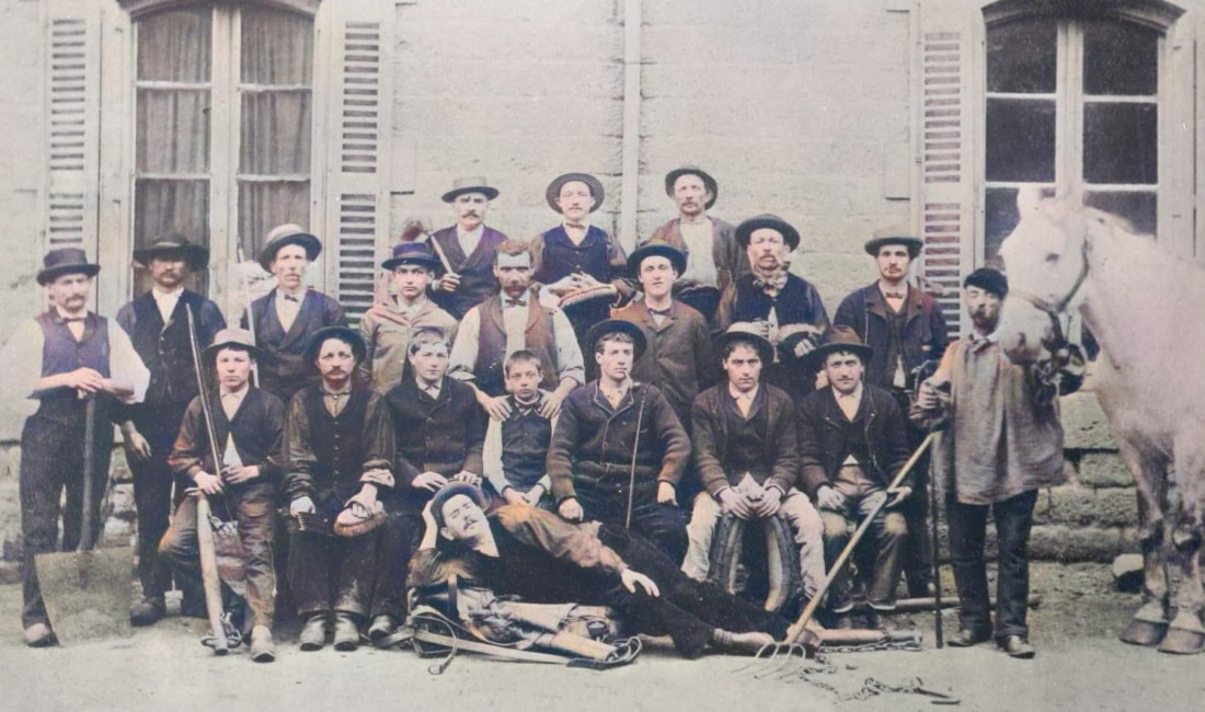 Cette photo de la collection du musée Jean Marie Somet n’est ni datée ni localisée. Elle est simplement légendée « les palefreniers de la Division Villars ». Une dénomination qu’il faut comprendre ici au sens large. On voit que le personnel de la Compagnie des Mines de la Loire prend spécifiquement la pause, chacun portant les attributs de son métier. Les palefreniers qui étaient en charge du soin des chevaux tiennent leur brosse d’étrillage en main. On reconnait également sur ce cliché le bourrelier avec le collier de trait, ou encore les « toucheurs » avec leur petit fouet pour guider les chevaux. Il fallait aussi compter sur les services réguliers du maréchal-ferrant.
