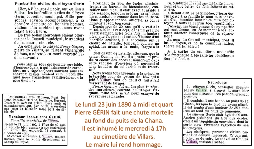 « Vous aimiez tous cet homme serviable, d’humeur égale, à qui la douceur de caractère, un visage toujours souriant sous ses cheveux blancs avaient valu le nom auquel nous l’appelions familièrement : « le père Gérin ». Président du Sou des écoles, administrateur du bureau de bienfaisance, conseiller municipal, il était exact et assidu à nos séances, toujours prêt au travail dans les commissions comme dans les délibérations, y apportant son autorité, sa bonne humeur et son bon coeur. Depuis près de 30 ans qu’il vivait à la mine, elle lui avait déjà, dans un premier avertissement, brisé trois fois la jambe. Hier elle l’a pris tout entier. Victime d’un horrible accident il a succombé sur le champ de bataille tombant comme un soldat les armes à la main, frappé à la tête. Quel champ de bataille, citoyens, que la mine ! Comme l’autre, il a produit et produira encore des héros si nombreux dans cette réunion d’ouvriers où germent si bien les idées de solidarité et de fraternité. Nous avons tous présents à la mémoire le terrible coup de grisou de 1867 qui a jeté Villars tant de deuil et a fait verser tant de larmes. Pierre Gérin y fut un des plus intrépides sauveteurs, courant au danger, risquant mille fois sa vie pour essayer de sauver ses camarades. Sa conduite lui valut une médaille d’honneur et une lettre de félicitations du ministre. À défaut d’autre patrimoine, Pierre Gérin laisse à sa famille le nom et le souvenir d’un honnête homme et d’un bon citoyen, à nous celui d’un bon républicain ».