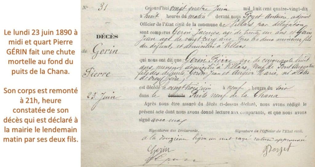 Pierre Gérin, conseiller municipal et président du sou des écoles chute au fond du puits de la Chana.