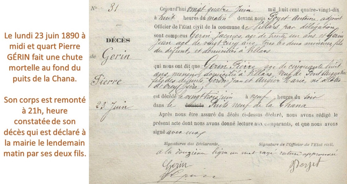 Le lundi 23 juin 1890 vers midi et quart, Pierre Gérin, mineur pourtant particulièrement expérimenté, allait trouver la mort au puits Neuf de la Chana (ainsi dénommé par opposition à l’ancien puits). Receveur à la recette, il poussait une benne vide, lorsque suite à une fausse manoeuvre il bascula dans le puits de remontée du charbon, profond de 320 mètres, dont le fond était rempli d’eau. Gravement blessé à la tête et au bras, il ne survécut pas à ses blessures. Ses deux fils, Jacques et Jean, également mineurs à la Chana, immédiatement appelés sur place ne purent que relever sa dépouille mortelle.
