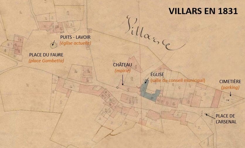 Le plan ci-contre (source : cadastre napoléonien) date de 1831. Il permet de se faire une idée de la configuration du Bourg de Villars à cette époque. On constate notamment l’espace libre autour de la place Gambetta qui à l’époque était dénommée place du Faure.