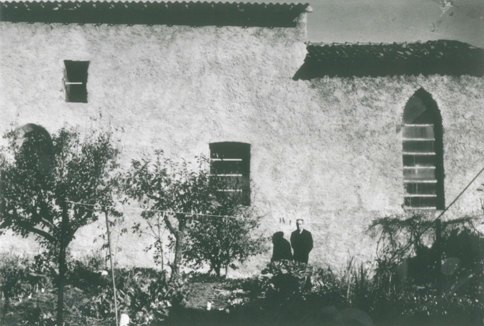 Vue arrière (dans les années 1970) de l’ancienne église. On devine bien la silhouette du bâtiment et de ses ouvertures.
