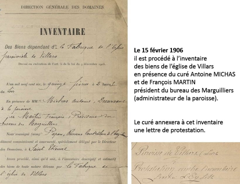 À l’époque c’est Antoine MICHAS qui est le curé de Villars et François MARTIN est en charge de la gestion de la paroisse. Le 15 février 1906 après midi, les deux hommes ont rendez-vous pour assister à l’inventaire des biens dépendants de l’église paroissiale comme l’impose la loi. Mais ce recensement se fait sous la contrainte. Le curé MICHAS va y adjoindre une lettre de protestation dont voici un extrait : « Nous ne sommes nullement ici pour prendre part à cet inventaire. Dans une attitude purement passive nous nous inclinons devant la force mais non devant le droit. Nous serons témoins, mais témoins hélas bien attristés ».