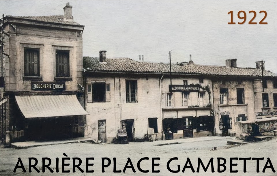 Elle montre le fond de la place Gambetta, juste derrière l’église, un secteur du centre ville rarement porté à l’image. Elle témoigne notamment de la présence de nombreux commerces tout autour de l’église. Le recensement de la commune a permis d’identifier les différents propriétaires.