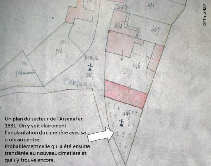 On trouve sa trace en 1868 sur le plan concernant l’aménagement du nouveau cimetière. On peut logiquement supposer que cette croix se situait auparavant dans l’ancien cimetière situé quartier de l’Arsenal.