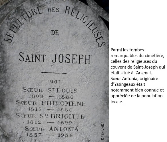 En 1869 était officialisé le don d’une concession à perpétuité aux soeurs de la communauté de Saint-Joseph. Leur sépulture s’y trouve encore. Ces religieuses habitaient dans un petit couvent à l’Arsenal qui fut mis à sac lors de la Révolution de 1848. Avant la construction de la nouvelle église, plusieurs religieuses et curés de la paroisse ont été inhumés directement sous la dalle de l’église, devenue aujourd’hui salle du conseil municipal.