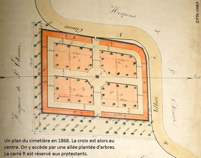 C’est à flanc de colline, sur le chemin en direction de Rochefoy (où se trouvait notamment une carrière de pierres), que la Municipalité choisit l’implantation du nouveau cimetière après acquisition du terrain auprès des Hospices de Saint-Étienne. Mais les ressources de la commune étant insuffisantes pour cet aménagement, il fut décidé d’un impôt supplémentaire qui prit le relais de celui déjà voté pour la construction de l’église. Un fond de secours de 2000 francs attribué par le Préfet permis de débuter les travaux.