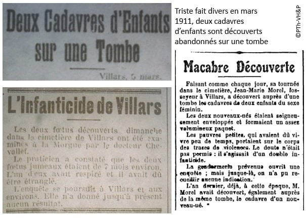 Et puis le 5 mars 1911, le cantonnier de la commune trouva ici au pied d’une tombe les corps abandonnés de deux bébés. L’analyse médicale détermina qu’il s’agissait d’un garçon et d’une fille, âgés d’environ 6 mois, un corps portant des traces de coups ayant entrainé la mort, probablement par strangulation. On avança l’hypothèse de jumeaux abandonnés par une famille de passage qui ne pouvait assurer leur subsistance. Cet infanticide ne sera jamais élucidé.
