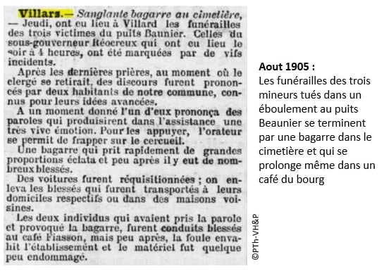 Le 8 août 1905, un éboulement avait fait trois morts au puits Beaunier. Cette catastrophe plongea dans le deuil la population ouvrière. Mais cette triste histoire ne s’arrêta pas là. Les funérailles eurent lieu pendant la vogue de Villars, le jeudi 10 août. Les manèges et tous les forains avaient fermé leurs stands en signe de deuil.